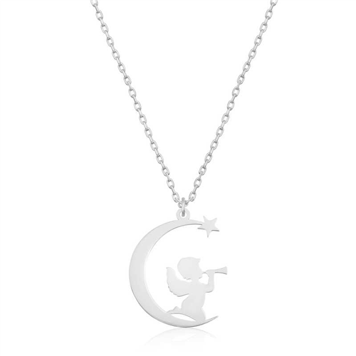Silver Angel Lady Sitting on the Moon Necklace Accessories with angel figures symbolizing purity and innocence are one of the best gift options for your loved ones. This angel lady sitting on the moon necklace model, designed with a heart-shaped angel motif, is made of 925 sterling silver. The silver angel lady sitting on the moon necklace is rhodium plated. All silver women's necklace models with rhodium plating preserve their shine for a long time and oxidation is delayed. The average chain length is 45 cm. As with all silver women's necklace models, the silver angel lady sitting on the moon necklace model is produced entirely by hand. Due to silver and precious stones, there may be ± 10% deviation from the average product weight. Width: 1.80 cm Length: 2.10 cm Average Weight: 3.00 gr. Chain Length: 45.00 cm