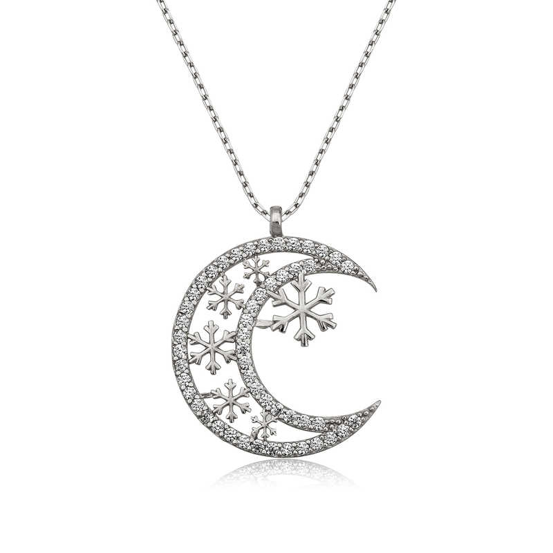 Silver Moon Snowflake Women's Necklace “Crescent” has become a symbol not because of its shape, but because of its name. When we write crescent, we use the letters of the name Allah (cc). Therefore, it is possible to use these two words interchangeably, especially symbolically. Snowflakes are never alike. The snowflake figure in accessories gives people the message that “Every snowflake is unique.” These two symbols also carry their unique meanings. You can gift this meaningful necklace to the people you love and care about. The necklace is made of 925 sterling silver. Rhodium plated silver preserves its shine and delays oxidation. The stones on it are zircon. Like all moon snowflake women's necklace models, the moon snowflake women's necklace is also handmade. Due to silver and precious stones, there may be ± 10% deviation in the average product weight. Width: 2.00 cm Length: 2.20 cm Average Weight: 2.50 gr. Chain Length: 45 cm