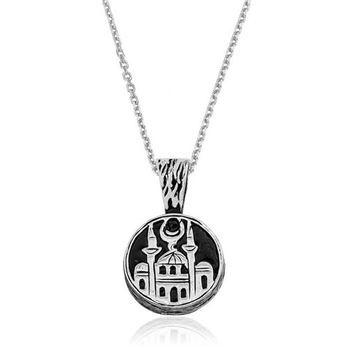 Silver Mosque Patterned Cevşen Necklace Mosques have an important place in Islam. Mosques are places of worship, remembrance of Allah, education, unity and peace, peace and tranquility. Religion is a system based on belief with a spiritual side. Allah is the absolute and only creator of the entire universe and all living and non-living beings. A silver mosque patterned necklace is a special accessory that believers may want to wear and keep with them in their daily lives. This necklace model will be a meaningful way to express spiritual feelings. This necklace with a stylish design will bring peace to you and your loved ones. The necklace with the mosque pattern on it is made of 925 sterling silver. The silver is oxidized coated. Oxidized silver necklace models have an aged model. The average silver chain length is 45 cm. Like all silver necklace models, the silver mosque patterned necklace model is also produced by hand. Due to silver and precious stones, there may be a ± 10% deviation in the specified product weight. Width: 1.50 cm Length: 1.50 cm Average Weight: 5.30 gr.