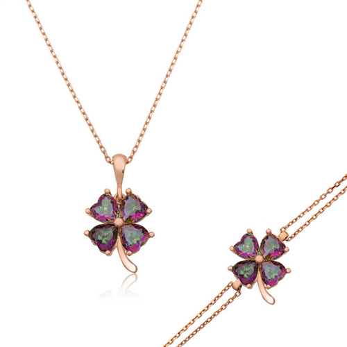 Silver Mystic Topaz Clover Women's Set Topaz, with its dazzling, sparkling, glassy appearance, is a rare gemstone. For this reason, colorless topaz can be confused with diamond. It comes in different colors, including colorless, white, gray, dull blue, yellow, red, etc. Mystic topaz is more effective on people with the zodiac signs of Leo, Virgo, Scorpio, Sagittarius, and Pisces. Some of its energetic benefits include relieving stress. It creates a sense of calm and peace. It uplifts. By reducing the varying effects of the moon's phases on people, it provides spiritual balance. It aids meditation. It enables the flow of universal energy into the body. It promotes relaxation and well-being. The four-leaf clover is considered a symbol of good luck in all cultures. The first leaf symbolizes hope, the second faith, the third love, and the fourth luck. This fourth leaf is very rare in nature. You can gift this meaningful bracelet that shines brightly to the person you love and value. All of our products are handmade and there may be ± 10% deviation in product weight due to precious stones. Necklace Width: 1.20 cm Necklace Length: 1.50 cm Bracelet Width: 1.20 Bracelet Length: 1.50 Bracelet chain length: 20 cm Bracelet Avg. Weight: 2.40 gr. Necklace Avg. Weight: 2.50 gr.
