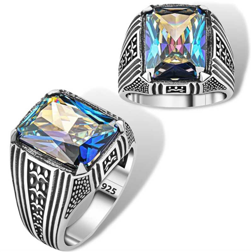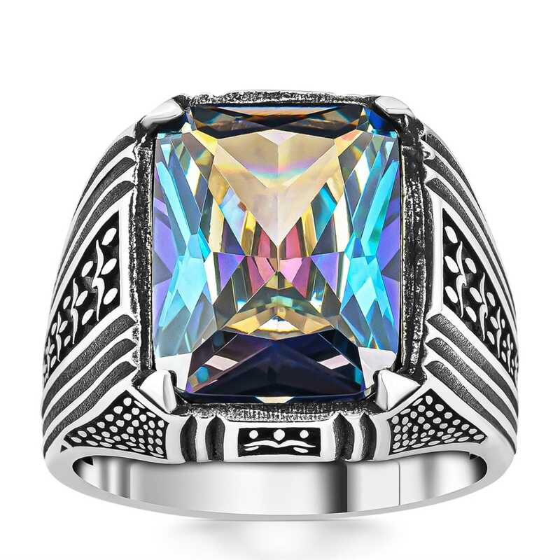 Silver Mystic Topaz Square Men's RingTopaz is a rare gemstone thanks to its dazzling, sparkling, glassy appearance. For this reason, colorless topaz can be confused with diamond. It comes in different colors, including colorless, white, gray, dull blue, yellow, red, etc. Mystic topaz is more effective on people with the zodiac signs of Leo, Virgo, Scorpio, Sagittarius, and Pisces. Some of its energetic benefits include relieving stress. It creates a sense of calm and peace. It uplifts. By reducing the different effects of the moon's phases on people, it provides spiritual balance. It aids meditation. It enables the flow of universal energy into the body. It provides relaxation and relief. You can gift this sparkling, meaningful mystic topaz square men's ring to the person you love and care about. All of our products are handmade and there may be a ± 10% deviation in product weight due to precious stones.Ring Width: 2.40 cm Ring Length: 2.80 cm Average Weight: 14 gr.