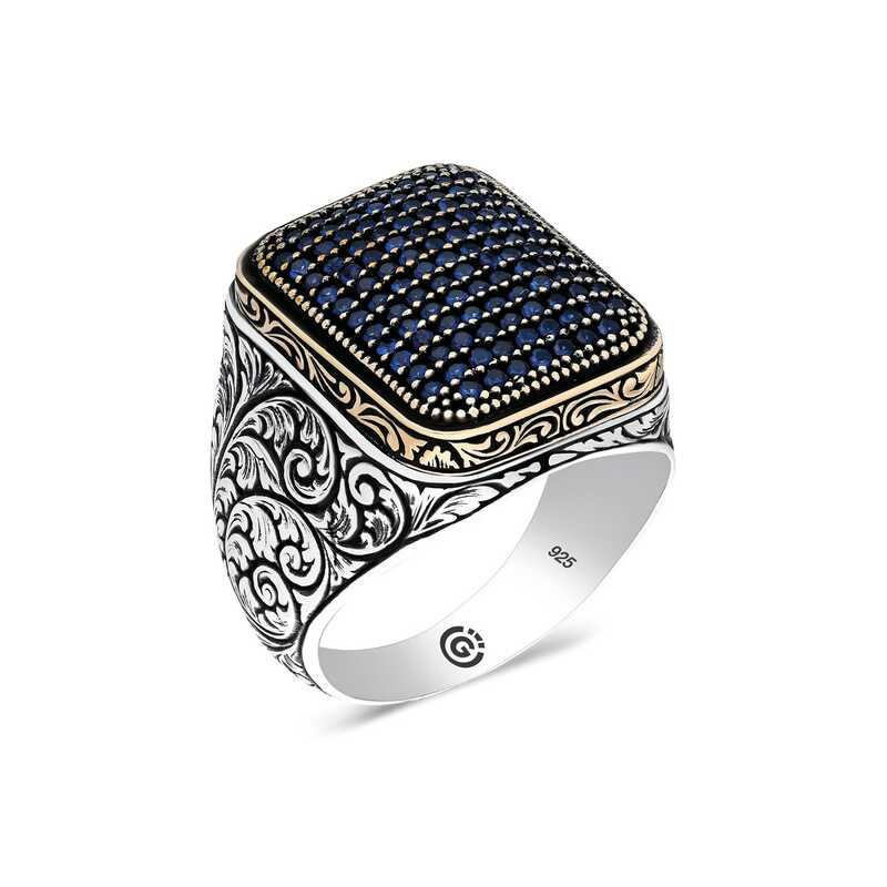 Silver Navy Blue Zircon Stone Square Men's Ring This men's ring model, made of zircon navy blue stone stones on silver, is a stylish accessory that you can use at any time of the day. You can gift this ring to yourself or your loved ones on your birthday, Father's Day or special occasions. The navy blue stone men's ring model is made of 925 sterling silver. Oxide coating is applied on the silver. Oxide coated silver men's ring models preserve their shine for a long time. As with all men's rings, the silver zircon navy blue stone men's ring model is also handmade. Due to silver and precious stones, there may be ± 10% deviation in the average product weight.Width: 2.50 cmLength: 3.00 cmAvg. Weight: 16 g.