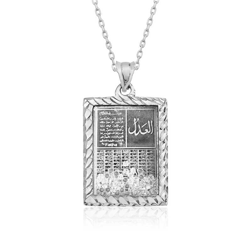 Silver Necklace with Fatiha and Esma'ul Husna Written Esma'ul Husna is the name given to the ninety-nine names of Allah, which mean the most beautiful names. This wonderful necklace, with Esma'ul Husna and Surah Fatiha written on it and zircon stones inside, is made of 925 sterling silver. The silver is rhodium-plated. Rhodium-plated silver necklace models maintain their shine for a long time. The chain that comes with the necklace is also silver and is 45 cm in length. This specially designed necklace is a perfect option for a birthday gift, a Valentine's Day gift or a gift for mothers on special occasions. Like all our silver necklace models, the silver Fatiha and Esma'ul Husna necklace model is handmade. There may be a ± 10% deviation in the specified product weight due to silver and precious stones. Width : 1.50 cm Height: 2.00 cm Average Weight: 4.56 gr.