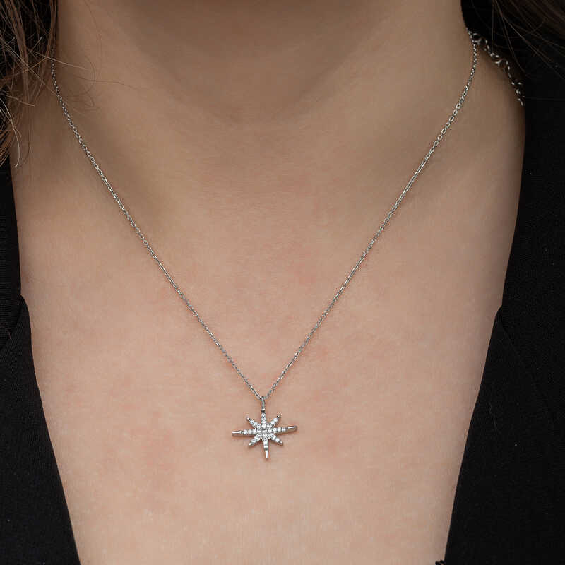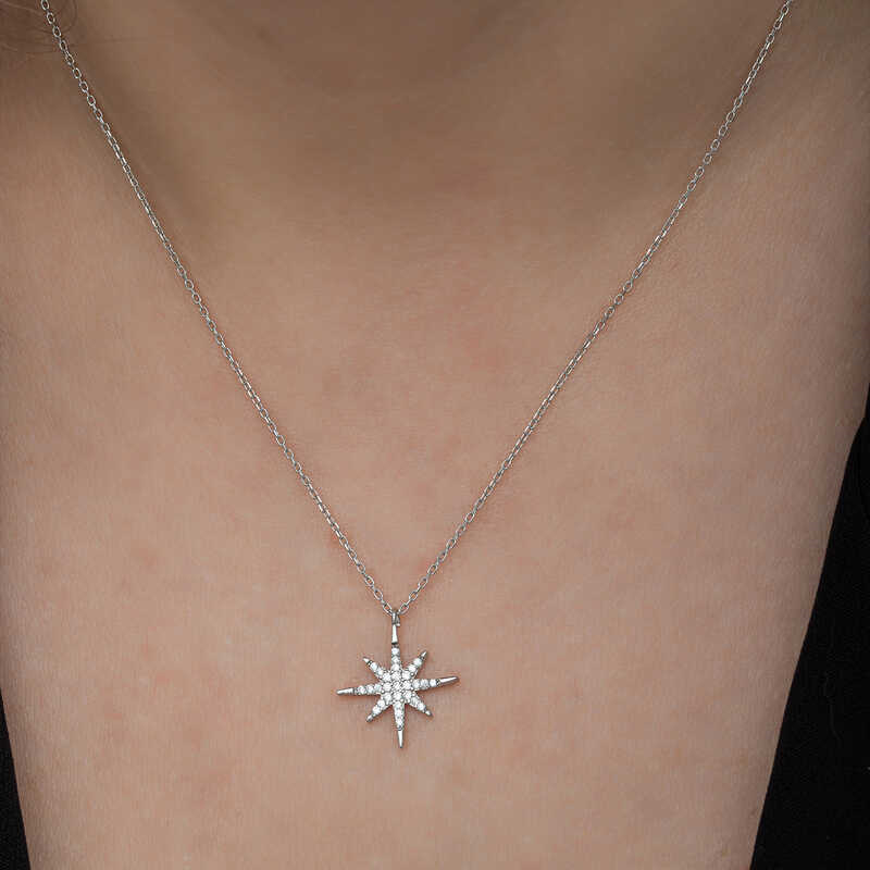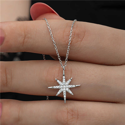 Silver Pole Star Women's Necklace The pole star is just one of millions of stars, but it is the star most impressed by the moon. Its only wish is to impress the moon. Its heart shines as it cries, and it thinks about how cold the moon is. It feels cold instead. Every moment it is seen on Earth is actually its dream coming true. The bigger the sky, the smaller the pole star. No matter how fast it moves, the pole star cannot reach the moon, nor the moon the sun. The sun does not give up its heat and turns its face to it. Crown your love that will never end until the apocalypse with this meaningful Pole Star necklace. This stylish necklace model is made of 925 sterling silver. Rhodium plated silver. Rhodium plated silver necklaces preserve their shine for a long time and delay oxidation. The stones on it are zircon. The average chain length is 45 cm. All of our products are handmade. Due to silver and precious stones, there may be ± 10% deviation in the average product weight. Width: 1.70 cm Height: 2.00 cm Average Weight: 2.20 gr.