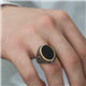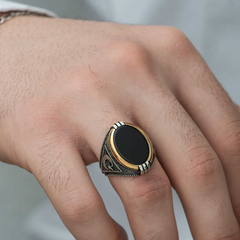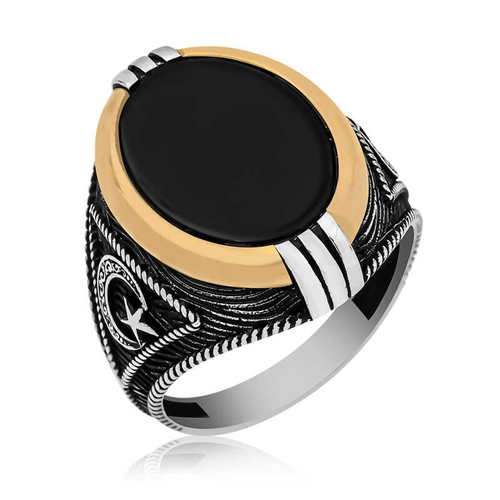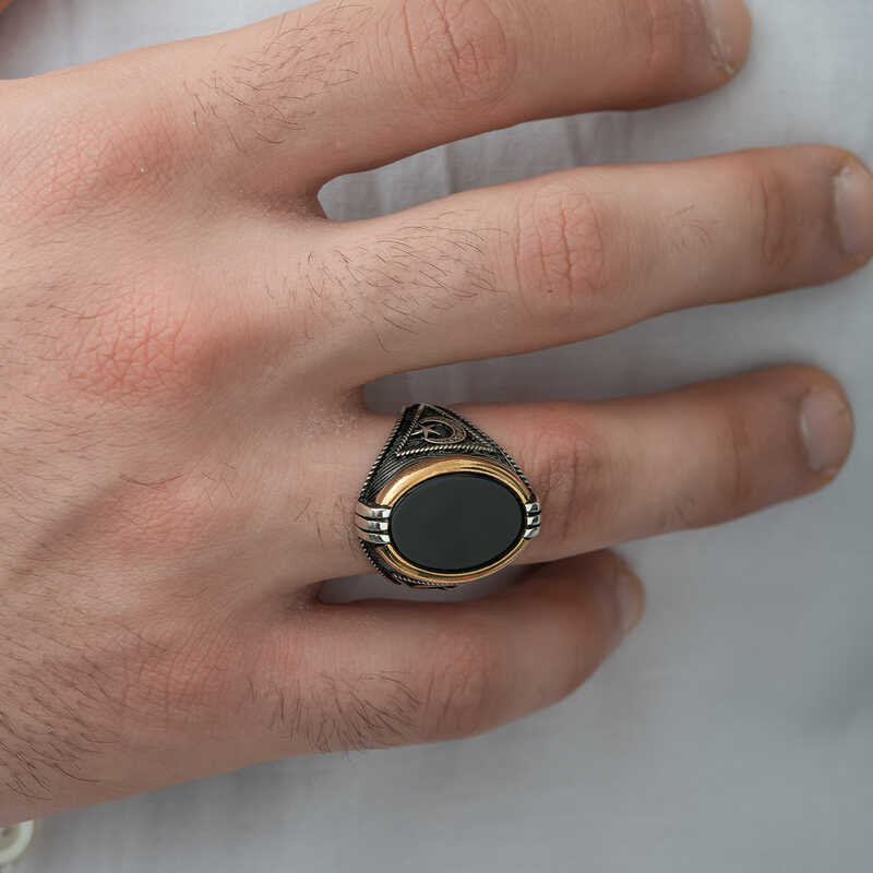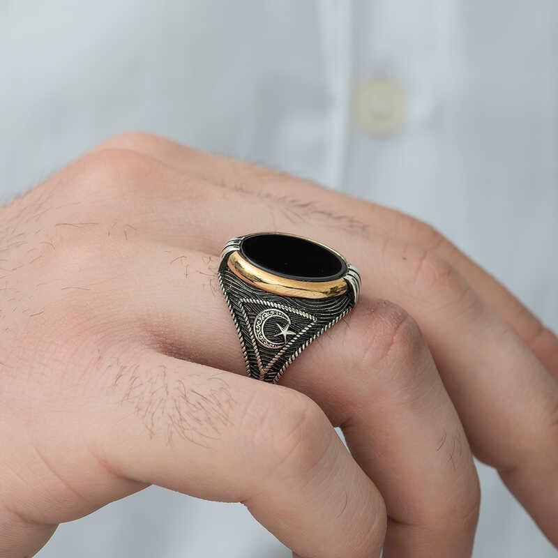 Silver Onyx Stone Crescent Star Crest Men's RingOnyx, which reached the earth's surface over millions of years, is a stone formed by the heating and cooling of rocks and some components over time. Onyx is known as the stone of luck and is a type of semi-precious stone. Due to its workability and aesthetically elegant, onyx has been used in the making of various ornaments and jewelry from ancient times to the present day. Onyx is the sacred stone of the earth signs Taurus, Virgo and Capricorn. People with these signs can be protected from negative energy by choosing onyx stone accessories. The crescent star motif on the sides of the ring "According to one view, the crescent on the Turkish Flag symbolizes "Islam" and the star "Turkishness"; according to another view, the star symbolizes "democracy", equality and freedom, and the crescent "Islam". You can choose this stylish ring for yourself or your loved ones on their birthdays, Father's Day or any special occasion. This stylish ring is made of 925 sterling silver. Oxidized silver is coated. Oxidized rings achieve an authentic look. Like all men's rings, the silver onyx stone crescent star crest men's ring model is handmade. Due to silver and precious stones, there may be a ± 10% deviation from the average product weight.Width: 1.50 cm.Length: 2.50 cm.Average Weight: 14.25 gr.