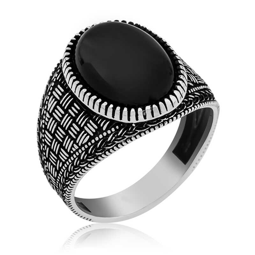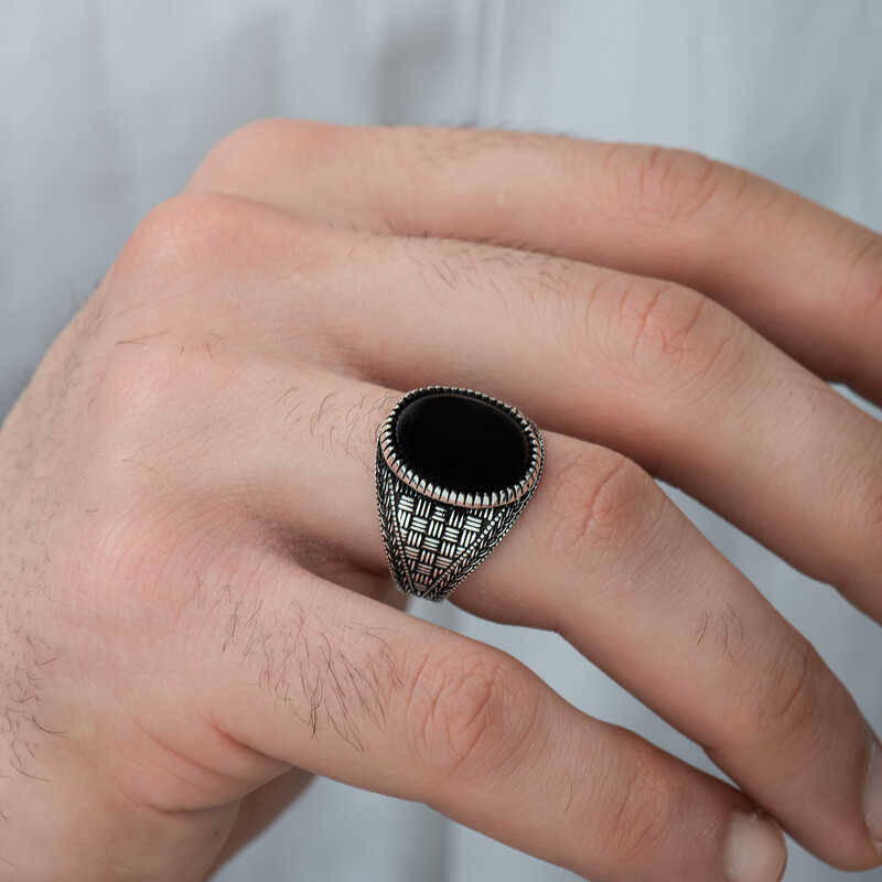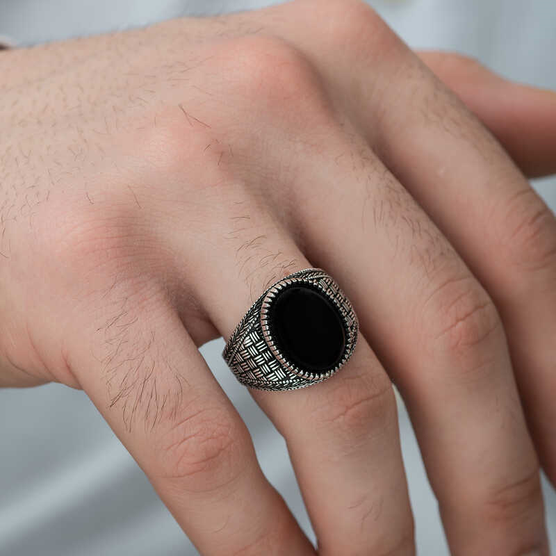 Silver Onyx Stone Knitted Patterned Men's RingOnyx, which reached the earth's surface over millions of years, is a stone formed by the heating and cooling of rocks and some components over time. Onyx is known as the stone of luck and is a type of semi-precious stone. Due to its workability and aesthetically elegant, onyx has been used in the making of various ornaments and jewelry from ancient times to the present day. Onyx is the sacred stone of the earth signs Taurus, Virgo and Capricorn. People with these signs can be protected from negative energy by choosing onyx stone accessories. You can choose this stylish ring for yourself or your loved ones on their birthdays, Father's Day or on special occasions. This stylish ring is made of 925 sterling silver. The silver is oxidized. Rings with oxidized coating achieve an authentic look. As with all men's rings, the silver onyx stone braided pattern men's ring model is also handmade. Due to silver and precious stones, there may be a ± 10% deviation from the average product weight.Width: 1.50 cm.Length: 2.00 cm.Average Weight: 7.70 gr.