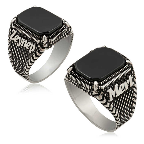 Silver Onyx Stone Name Written Men's Ring The highest quality and stylish men's jewelry is offered to men with new models. Why not a nice ring to impress a woman? This silver onyx stone personalized name writable men's ring is specially handcrafted. You can be happy to gift this silver ring that you can carry on your finger every day with its classic model to your friends. It is silver oxide coated. As with all silver men's rings, the silver onyx stone name writable ring is also handmade. Due to silver and precious stones, there may be ± 10% deviation in the specified product weight. Note: Please specify the names you would like written next to them in the notes section when ordering. Width: 1.50 cm Length: 2.00 cm Avg. Weight: 8.00 gr.