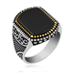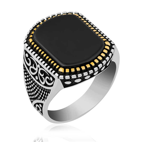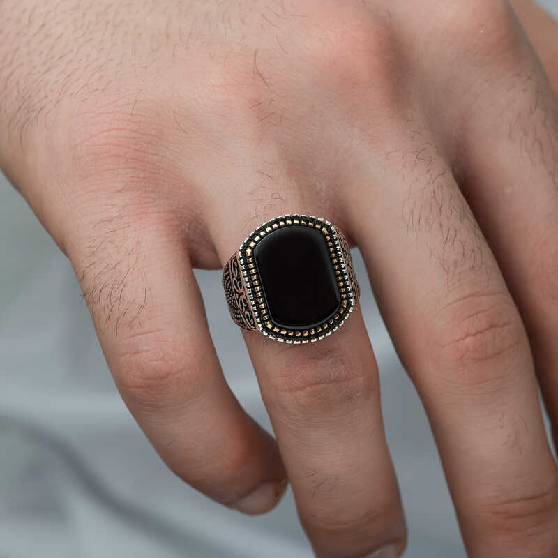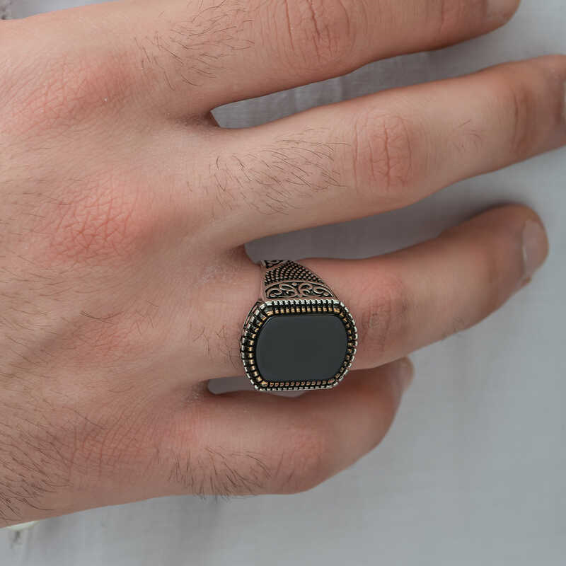 Silver Onyx Stone Patterned Men's RingOnyx, which reached the earth's surface over millions of years, is a stone formed by the heating and cooling of rocks and some components over time. Onyx is known as the stone of luck and is a type of semi-precious stone. Due to its workability and aesthetically elegant, onyx has been used in the making of various ornaments and jewelry from ancient times to the present. Onyx is the sacred stone of the earth signs Taurus, Virgo and Capricorn. People with these signs can be protected from negative energy by choosing onyx stone accessories. You can gift this stylish ring to yourself or your loved ones on your birthday, Father's Day or other special occasions. This stylish ring is made of 925 sterling silver. The silver is oxidized. Rings with oxidized coating achieve an authentic look. As with all men's rings, the silver onyx stone patterned men's ring model is also handmade. Due to silver and precious stones, there may be a ± 10% deviation from the average product weight.Width: 1.80 cm.Length: 2.30 cm.Average Weight: 13.20 gr.