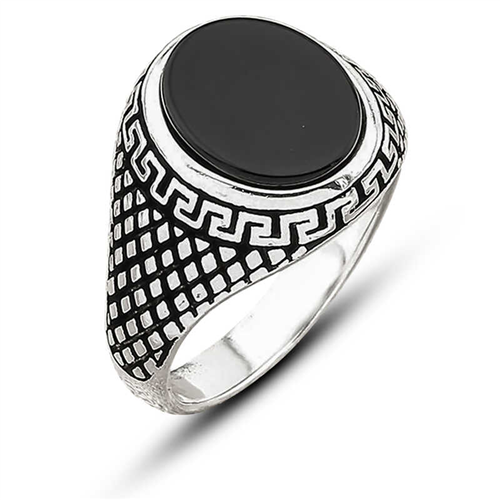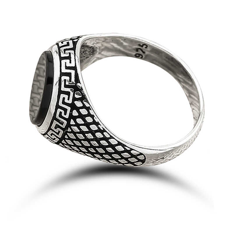 Silver Onyx Stone Patterned Men's Ring Onyx, which reached the earth's surface over millions of years, is a stone formed by the heating and cooling of rocks and some components over time. Onyx is known as the stone of luck and is a type of semi-precious stone. Due to its workability and aesthetically elegant, onyx has been used in the making of various ornaments and jewelry from ancient times to the present. Onyx is the sacred stone of the earth signs Taurus, Virgo and Capricorn. People with these signs can be protected from negative energy by choosing onyx stone accessories. You can gift this stylish ring to yourself or your loved ones on your birthday, Father's Day or other special occasions. This stylish ring is made of 925 sterling silver. The silver is oxidized. Rings with oxidized coating achieve an authentic look. As with all men's rings, the silver onyx stone patterned men's ring model is also handmade. Due to silver and precious stones, there may be a ± 10% deviation from the average product weight. Width: 2.00 cm. Length: 2.30 cm. Average Weight: 6.10 gr.