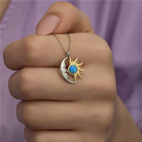 Silver Opal Blue Stone Moon Sun Women's Necklace The sun is the symbol of light, knowledge, goodness, power and management. The moon is an important stone that represents feminine energy. The moon, known to balance female hormones, is also a stabilizer and calmer in general. Because it is also associated with emotions, it is also known as the love stone. This dazzling necklace with its sparkling and different design is made of 925 sterling silver. Rhodium and gold plated silver. Rhodium and gold plated silver products preserve their shine for a long time and oxidation is delayed. Like all silver necklaces, the opal blue stone moon sun women's necklace is entirely handmade. Due to silver and precious stones, there may be a ± 10% deviation in the average product weight. Width: 1.60 cm Length: 1.90 cm Average Weight: 2.30 gr.