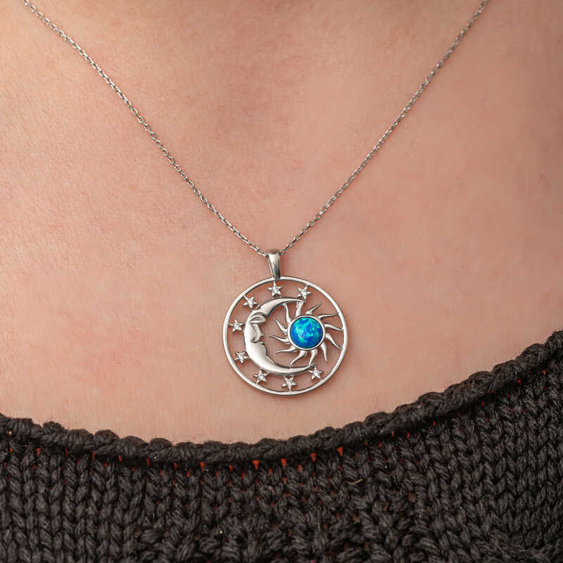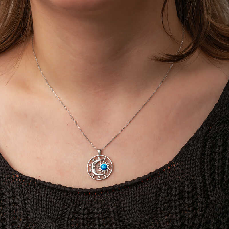 Silver Opal Blue Stone Moon Sun Women's Necklace The sun is the symbol of light, knowledge, goodness, power and management. The moon is an important stone that represents feminine energy. The moon, known to balance female hormones, is also a stabilizer and calmer in general. Because it is also associated with emotions, it is also known as the love stone. This dazzling necklace with its sparkling and different design is made of 925 sterling silver. Rhodium plated silver. Rhodium plated silver products preserve their shine for a long time and oxidation is delayed. Like all silver necklaces, the opal blue stone moon sun women's necklace is entirely handmade. Due to silver and precious stones, there may be a ± 10% deviation in the average product weight. Necklace Diameter: 2.00 cm Average Weight: 2.30 gr.