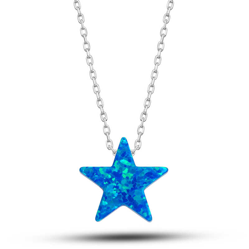 Silver Opal Blue Stone Star Women's Necklace The star is an auspicious symbol believed to bring luck in many societies and teachings. It carries the energy of the Planet Venus. The Planet Venus is also the representative of the energy of love and romance. This stylish star necklace made of opal stone is a perfect option for a birthday gift, Valentine's Day gift or on special occasions. Silver rhodium opal blue stone star women's necklace is made of 925 sterling silver. This necklace is rhodium plated. Rhodium plated silver women's necklace models preserve their shine for a long time. As with all our silver women's necklace models, the silver rhodium opal blue stone star women's necklace model is produced by hand. Due to silver and precious stones, there may be ± 10% deviation in the average product weight. Width: 1.00 cm Length: 1.00 cm Average Weight: 1.10 gr. Chain Length: 45.00 cm