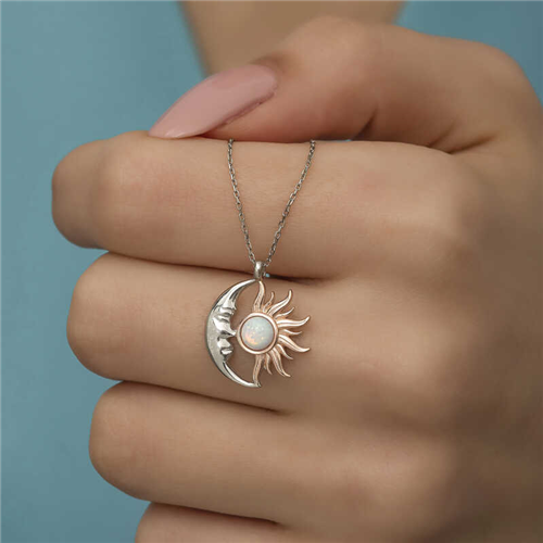 Silver Opal White Stone Moon Sun Women's Necklace The sun is the symbol of light, knowledge, goodness, power and management. The moon is an important stone that represents feminine energy. The moon, known to balance female hormones, is also a stabilizer and calmer in general. Because it is also associated with emotions, it is also known as the love stone. This dazzling necklace with its sparkling and different design is made of 925 sterling silver. Rhodium and rose plated on the silver. Silver products with rhodium and rose plated preserve their shine for a long time and oxidation is delayed. Like all silver necklaces, the opal white stone moon sun women's necklace is entirely handmade. Due to silver and precious stones, there may be a ± 10% deviation in the average product weight. Width: 1.60 cm Length: 1.90 cm Average Weight: 2.30 gr.