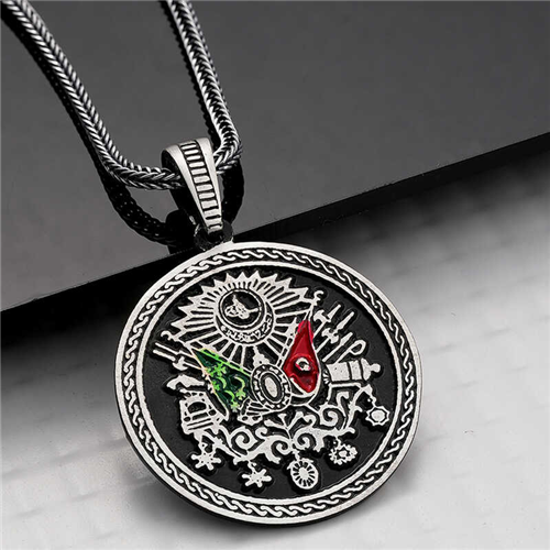 Silver Ottoman Coat of Arms Men's Necklace The State Coat of Arms of the Ottoman Empire was prepared for the Ottoman Empire in the 19th century. Before that, the sultans' tughras served as state decorations. The final version of the Ottoman decoration was enacted by Sultan Abdulhamid II in 1882. There are two flags inside the Ottoman State Decoration. The flag with the crescent and star on a red background symbolizes the Ottoman Dynasty, while the flag on the green background symbolizes the Islamic caliphate. The scales represent Ottoman justice, and the books on the scales represent the Ottoman code of laws, the source of justice, and the Quran. You can gift this stylish necklace to your loved ones on their birthdays, special days or Father's Day and make them happy. This specially designed men's necklace is made of 925 sterling silver. The silver is oxidized. Like all silver men's necklaces, the silver Ottoman coat of arms men's necklace is handmade. Due to silver and precious stones, there may be ± 10% deviation in the specified product weight. Necklace Diameter: 2.80 cm Chain Length: 55 cm Average Weight: 13.60 gr.