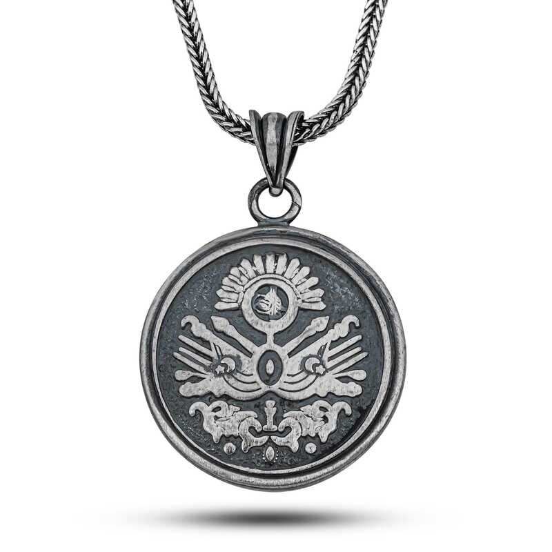 Silver Ottoman State Coat of Arms Cevşen Necklace The coat of arms and motifs of the Ottoman Empire have been symbols of sovereignty, protection, and power throughout history. This necklace, reflecting the splendor and cultural heritage of the Ottoman Empire, is believed to bring luck and protection to the wearer. In addition, Ottoman motifs and symbols are seen as symbols of loyalty, power, and validity. In general, this necklace carries a historical narrative and is believed to provide spiritual power and protection to the wearer. It is a meaningful and valuable piece of jewelry for those interested in Ottoman history and culture. Oxidized silver is coated. Oxidized silver necklaces preserve their shine for a long time and oxidation is delayed. All of our products are hand-made. Due to silver and precious stones, there may be a ± 10% deviation in the average product weight. Product Width: 2.00 cm Product Length: 3.000 cm. Chain Length: 55.00 cm. Average Weight: 11.60 gr.