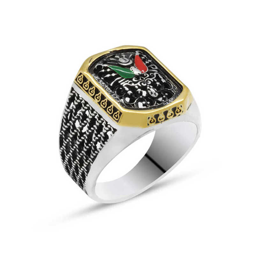Silver Ottoman State Coat of Arms Men's RingThe Ottoman State Coat of Arms was designed for the Ottoman Empire in the 19th century, inspired by the insignia of the United Kingdom and Europe. Before that, the tughras of the sultans served as state decorations. The final version of the Ottoman Decoration was enacted in 1882 by Sultan Abdulhamid II. There are two flags in the Ottoman State Coat of Arms. The flag with the star and crescent on a red background symbolizes the Ottoman Empire, while the flag on a green background symbolizes the Islamic Caliphate. The scales represent Ottoman justice, and the books on the scales represent the Ottoman law codes, the source of justice, and the Quran. It is known that there are 30 mysteries hidden in the Ottoman State Coat of Arms. This elegant men's ring model is made of 925 sterling silver. The silver is oxidized to create an aged appearance. Like all silver men's rings, the silver Ottoman State Coat of Arms men's ring is handmade. Due to the silver and precious stones, there may be a ±10% deviation from the stated average product weight.Average Weight: 13.50 gr.