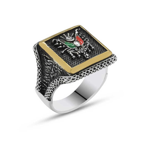 Silver Ottoman State Coat of Arms Men's RingThe Ottoman State Coat of Arms was designed for the Ottoman Empire in the 19th century, inspired by the insignia of the United Kingdom and Europe. Before that, the tughras of the sultans served as state decorations. The final version of the Ottoman decoration was enacted by Sultan Abdulhamid II in 1882. There are two flags in the Ottoman State Coat of Arms. The flag with the star and crescent on a red background symbolizes the Ottoman Empire, while the flag on a green background symbolizes the Islamic Caliphate. The scales represent Ottoman justice, and the books on the scales represent the Ottoman law codes, which are the source of justice, and the Quran. It is known that there are 30 mysteries hidden in the Ottoman State Coat of Arms. This elegant men's ring model is made of 925 sterling silver. The silver is oxidized to create an aged appearance. Like all silver men's rings, the silver Ottoman State Coat of Arms men's ring is handmade. Due to the silver and precious stones, there may be a ±10% deviation from the stated average product weight.Average Weight: 13.00 gr.