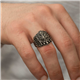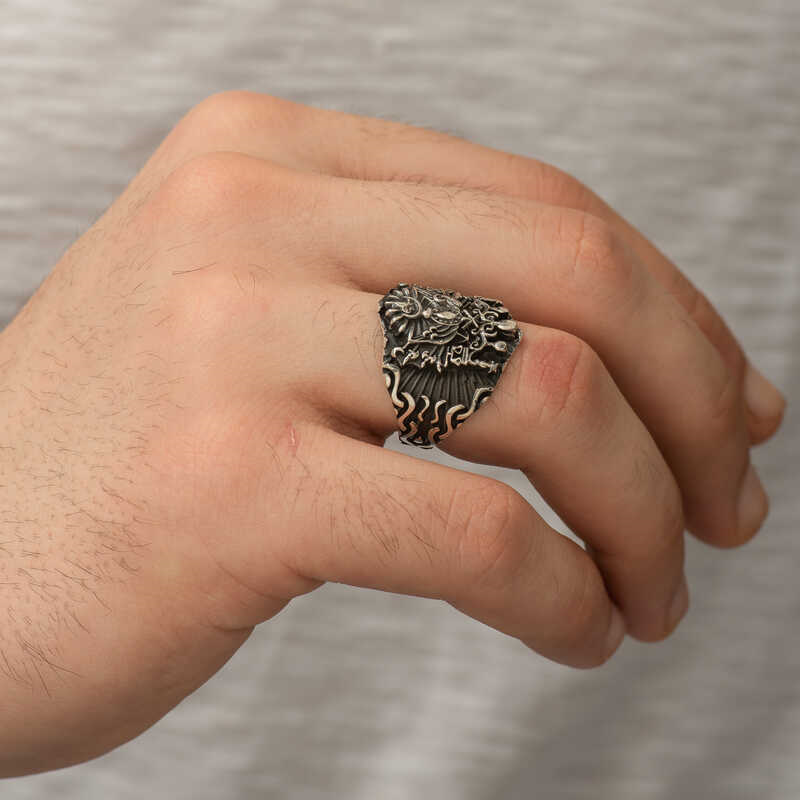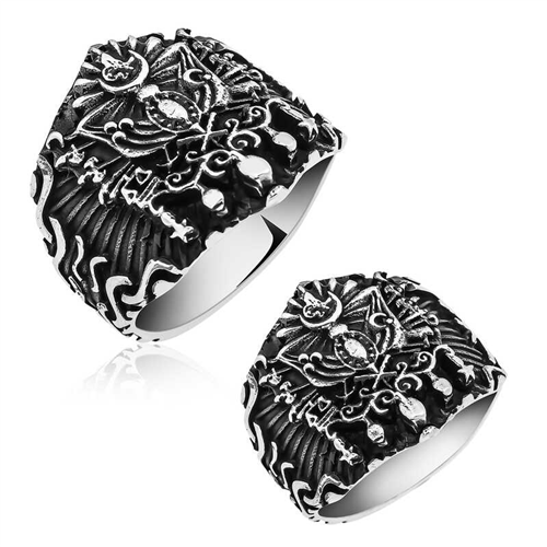 Silver Ottoman State Coat of Arms Men's RingThe Ottoman State Coat of Arms was designed for the Ottoman Empire in the 19th century, inspired by the insignia of the United Kingdom and Europe. Before that, the tughras of the sultans served as state decorations. The final version of the Ottoman decoration was enacted by Sultan Abdulhamid II in 1882. There are two flags in the Ottoman State Coat of Arms. The flag with the star and crescent on a red background symbolizes the Ottoman Empire, while the flag on a green background symbolizes the Islamic Caliphate. The scales represent Ottoman justice, and the books on the scales represent the Ottoman law codes, which are the source of justice, and the Quran. It is known that there are 30 mysteries hidden in the Ottoman State Coat of Arms. This elegant men's ring model is made of 925 sterling silver. The silver is oxidized to create an aged appearance. Like all silver men's rings, the silver Ottoman State Coat of Arms men's ring is handmade. Due to the silver and precious stones, there may be a ±10% deviation from the stated average product weight.Ring Width: 2.30 cmRing Length: 2.50 cmAverage Weight: 10.50 gr.