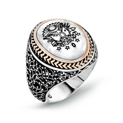 Silver Ottoman State Coat of Arms Men's Ring with Mother-of-PearlThe State Coat of Arms of the Ottoman Empire was prepared for the Ottoman Empire in the 19th century. Before that, the tughras of the sultans served as state decorations. The final version of the Ottoman decoration was put into effect by Sultan Abdulhamid II in 1882. There are two flags inside the Ottoman State Decoration. The flag with the crescent and star on a red field symbolizes the Ottoman Dynasty, while the flag on the green field symbolizes the Islamic caliphate. The scales represent Ottoman justice, and the books on the scales represent the Ottoman code of laws, the source of justice, and the Quran. You can gift this stylish ring to your loved ones on birthdays, special occasions, or Father's Day and make them happy. This specially designed men's ring is made of 925 sterling silver. The silver is oxidized. As with all silver men's rings, the silver Ottoman state coat of arms and mother-of-pearl men's ring is handmade. Due to silver and precious stones, there may be a ± 10% deviation from the average product weight.Average Weight: 16.00 gr.