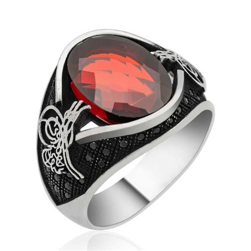 Silver Ottoman Tughra Men's RingTuğra is a symbol or signature that includes the sultan's name and nickname. Tughra, a branch of calligraphy, has been written by master calligraphers for centuries. In Turkish, it means a special sign containing the sultan's name, the sultan's signature. The original name, tugra, is in the Oghuz dialect and means the printed signature of the sultan. The ring is made of 925 sterling silver. The silver is oxide coated and the stone on it is zircon. All of our products are handmade. Due to silver and precious stones, there may be ± 10% deviation from the average product weight.Width: 2.00 cm. Length: 1.70 cm. Weight: 10.00 gr.