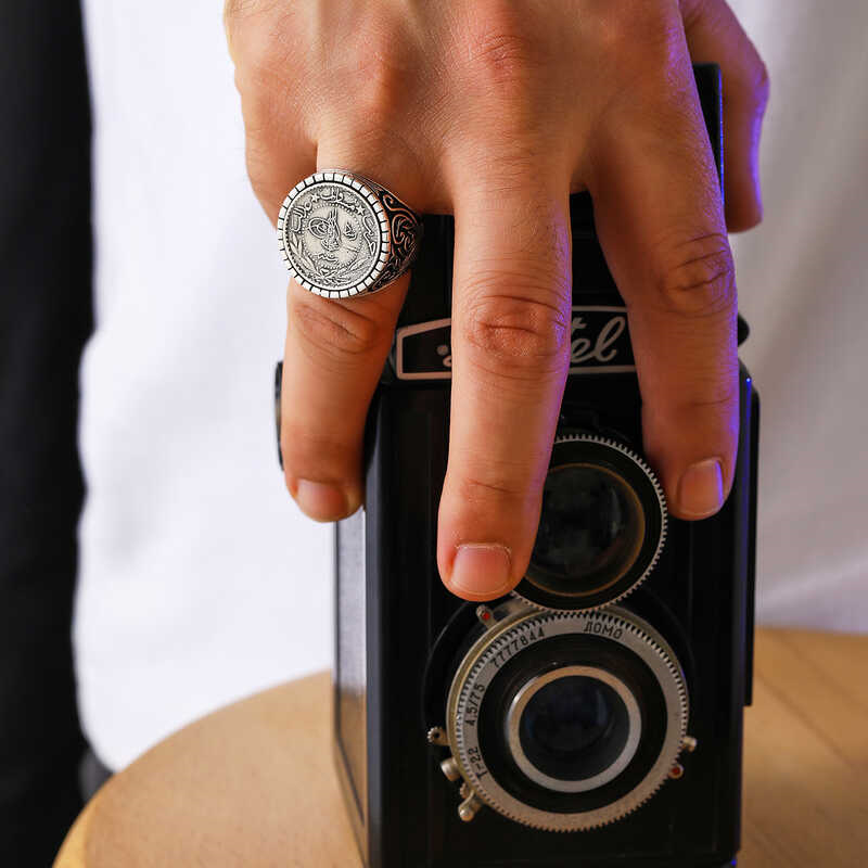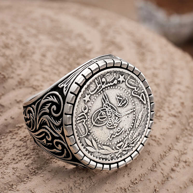 Silver Ottoman Tughra Men's RingTughra means the signature of the Ottoman sultans. Each tugra expresses the name, existence, and sovereignty of the sultan it belongs to. The tugra symbol; freedom, equality, and justice are written from right to left. The tugra symbol has survived to the present day in many forms, different for each sultan. The tugra has been preserved in every period of the Ottoman Empire and has never lost its importance. And over time, it has also held an important place in our art of calligraphy, and is kept alive artistically by calligraphers today. You can enjoy using this silver ring that reflects this art and gift it to your loved ones. The Ottoman Tughra Men's Ring Model is made of 925 sterling silver. The silver is oxidized. Like all silver men's rings, the silver Ottoman Tughra men's ring model is produced entirely by hand. Due to silver and precious stones, there may be a ± 10% deviation in the average product weight.Ring Width: 2.30 cmRing Length: 2.60 cmAverage Weight: 14.50 gr