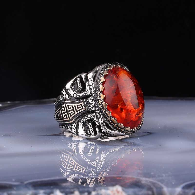 Silver Amber Stone Oval Men's RingThis men's ring model made of amber stone on silver is a stylish accessory that you can use at any time of the day. You can gift this ring to yourself or your loved ones on your birthday, Father's Day or special occasions. The domed oval amber stone men's ring model is made of 925 sterling silver. Oxidized silver is coated. Oxidized silver men's rings preserve their shine for a long time. As with all men's rings, the silver amber stone oval men's ring model is also handmade. Due to silver and precious stones, there may be ± 10% deviation from the average product weight.Width: 1.70 cmLength: 2.10 cmAvg. Weight: 18.50 gr.