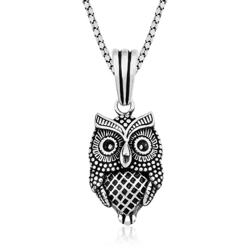 Silver Owl Necklace The owl is a mythological animal with rich meanings in history and different cultures. The reason why owl accessories are so popular is because they have strong symbolic meanings. Thanks to its ability to see at night, it symbolically represents wisdom due to its strong intuitive powers. You can love this necklace in daily life and gift it to your loved ones on special occasions. This stylishly designed necklace is made of 925 sterling silver. The silver is oxidized. As with all silver products, the silver owl necklace is entirely handmade. Due to silver and precious stones, there may be ± 10% deviation from the average product weight. Width: 1.30 cm Length: 3.40 cm Avg. Weight: 10.00 gr. Chain length: 55 cm