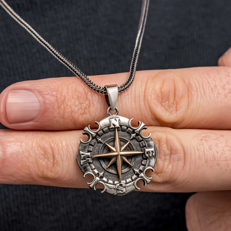 Silver Oxidized Compass Men's Necklace The compass is the symbol of finding direction and progressing on the right path. It represents finding the right direction in life, achieving goals and the search for guidance. The compass necklace, the choice of those who say "You are in my direction, in my path", is waiting for you. The compass necklace model is made of 925 sterling silver. This stylish necklace; You can choose it as a birthday gift, Valentine's Day gift or a gift on special occasions. Oxidized silver is coated. Oxidized silver necklaces preserve their shine for a long time. Like all necklaces, this silver compass necklace is also entirely handmade. Due to silver and precious stones, there may be ± 10% deviation in the average product weight. Width: 2.50 cm Length: 3.50 cm Chain Length: 55 cm Average Weight: 14.00 gr.