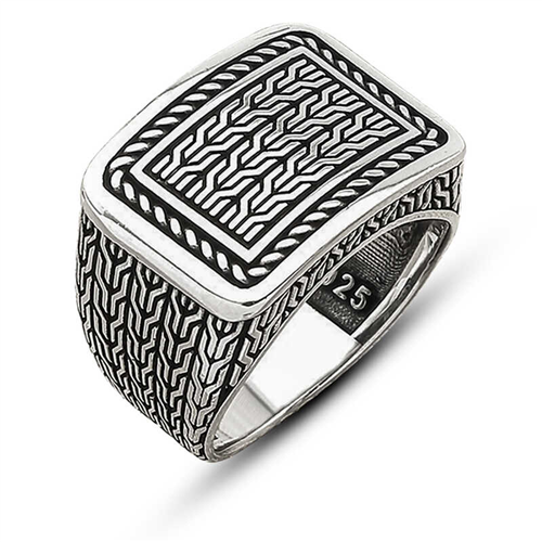 Silver Patterned Men's Ring This stylish design was created for you ... This perfect ring; you can gift it to yourself or your loved ones on your birthday, Father's Day or special occasions. This men's ring that everyone will love is made of 925 sterling silver. Oxidized coating is applied on the silver. Like all silver men's rings, the silver patterned men's ring is produced entirely by hand. Due to silver and precious stones, there may be ± 10% deviation from the average product weight. Width: 2.40 cm Length: 2.60 cm Weight: 9.80 gr.