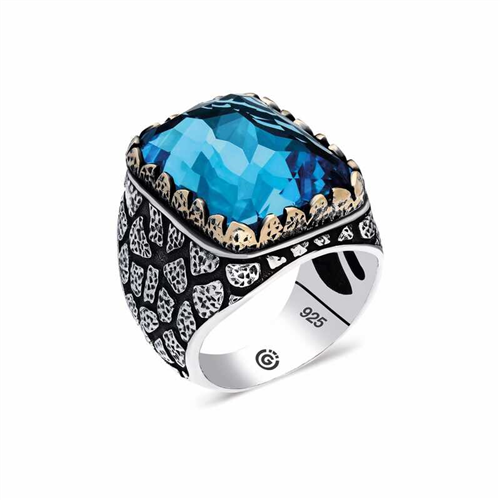 Silver Patterned Zircon Blue Stone Square Men's RingThis men's ring model, made of Patterned Zircon Blue Stone on silver, is a stylish accessory that you can use at any time of the day. You can gift this ring to yourself or your loved ones on your birthday, Father's Day or special occasions. Blue stone square ring men's ring model is made of 925 sterling silver. Oxidized silver is coated. Oxidized silver men's rings preserve their shine for a long time. As with all men's rings, the silver patterned zircon blue stone square men's ring model is also handmade. Due to silver and precious stones, there may be a ± 10% deviation from the average product weight.Average Weight: 17.00 gr.