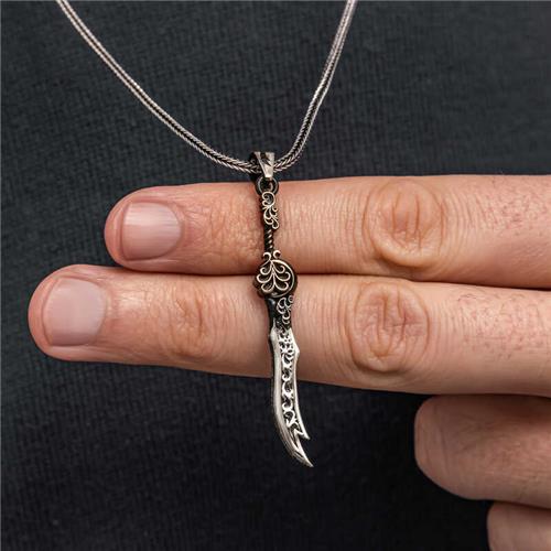 Silver Patterned Zulfiqar Sword Men's Necklace Zulfiqar is an important symbol in Islamic history and is considered to belong to Hz. Ali. This sword is seen as a symbol of justice, courage and power. The meaning of wearing this type of necklace can attribute many values to the person. The Zulfiqar sword also symbolizes the ability to overcome difficulties. This stylish necklace; It is a perfect option for a birthday gift, Valentine's Day or Father's Day. Oxidized silver is coated. Like all silver necklaces, the silver Zulfiqar sword necklace model is also handmade. Due to silver and precious stones, there may be ± 10% deviation in the average product weight. Width: 0.50 mm Length: 6.00 cm Chain Length: 55 cm Average Weight: 12.00 gr.