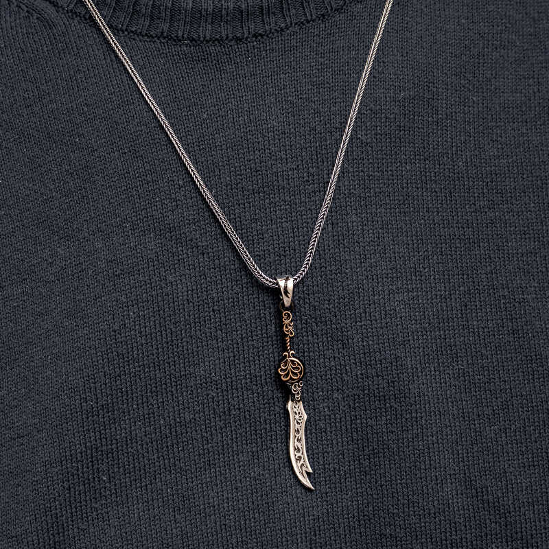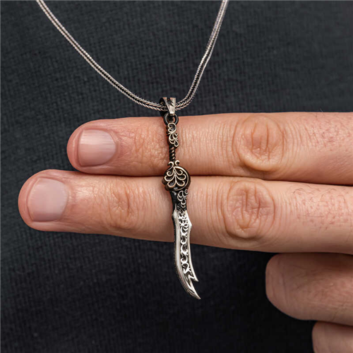 Silver Patterned Zulfiqar Sword Men's Necklace Zulfiqar is an important symbol in Islamic history and is considered to belong to Hz. Ali. This sword is seen as a symbol of justice, courage and power. The meaning of wearing this type of necklace can attribute many values to the person. The Zulfiqar sword also symbolizes the ability to overcome difficulties. This stylish necklace; It is a perfect option for a birthday gift, Valentine's Day or Father's Day. Oxidized silver is coated. Like all silver necklaces, the silver Zulfiqar sword necklace model is also handmade. Due to silver and precious stones, there may be ± 10% deviation in the average product weight. Width: 0.50 mm Length: 6.00 cm Chain Length: 55 cm Average Weight: 12.00 gr.