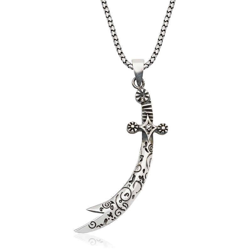 Silver Patterned Zulfiqar Sword Necklace Hz. Ali showed great heroism in the Battle of Uhud. His sword broke while trying to protect the Prophet Muhammad (pbuh) in the battle. Seeing this, the Prophet gave him his own sword, Zulfiqar. With the sharpness of the sword, he split other swords in half and wrote epics in battles. Hz. Ali is now in battles with the Zulfiqar sword... It is known that the sword was taken to heaven after Hz. Ali's death. According to another narration, it is known to be between the Tigris and Euphrates rivers. The person who will rule the armies of Islam will own that sword and be the commander-in-chief of the armies. You can choose this stylish necklace as a birthday gift, Valentine's Day gift or a gift on special occasions. The necklace is made of 925 sterling silver. Oxide coating on silver. Oxide coating preserves its shine for a long time and gives the silver its black color. Like all our necklaces, this silver Zulfiqar sword necklace is also entirely handmade. Due to silver and precious stones, there may be a ± 10% deviation from the average product weight. Width: 1.30 cm Length: 5.00 cm Average Weight: 11.00 gr.