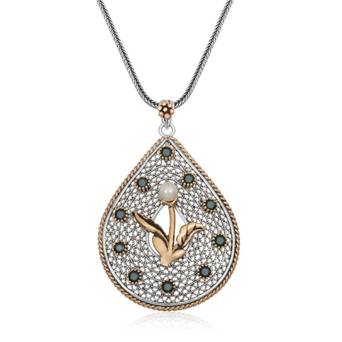 Silver Pearl Flower Authentic Women's Necklace This stylish design pearl flower model authentic necklace model is produced using 925 sterling silver and bronze mines. This patterned authentic pearl flower women's necklace model, manufactured using red and green zircon stones, is oxidized. Oxidized silver authentic women's necklace models preserve their first-day state for a long time. The chain that comes with the silver authentic women's necklace model is made of 925 sterling silver and is 55 cm in length. As with all silver authentic necklace models, the silver authentic pearl flower necklace model is also handmade. Due to silver and precious stones, there may be ± 10% deviation in the average product weight. This authentic necklace, which will never go out of fashion and appeals to all women who want to capture an elegant look, is waiting for you. Necklace Width: 3.90 cm Necklace Length: 5.70 cm Chain Length: 55 cm Average Weight: 17.00 gr