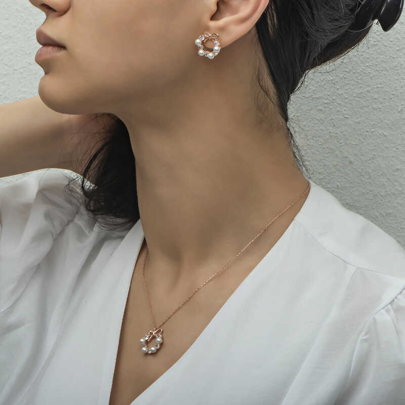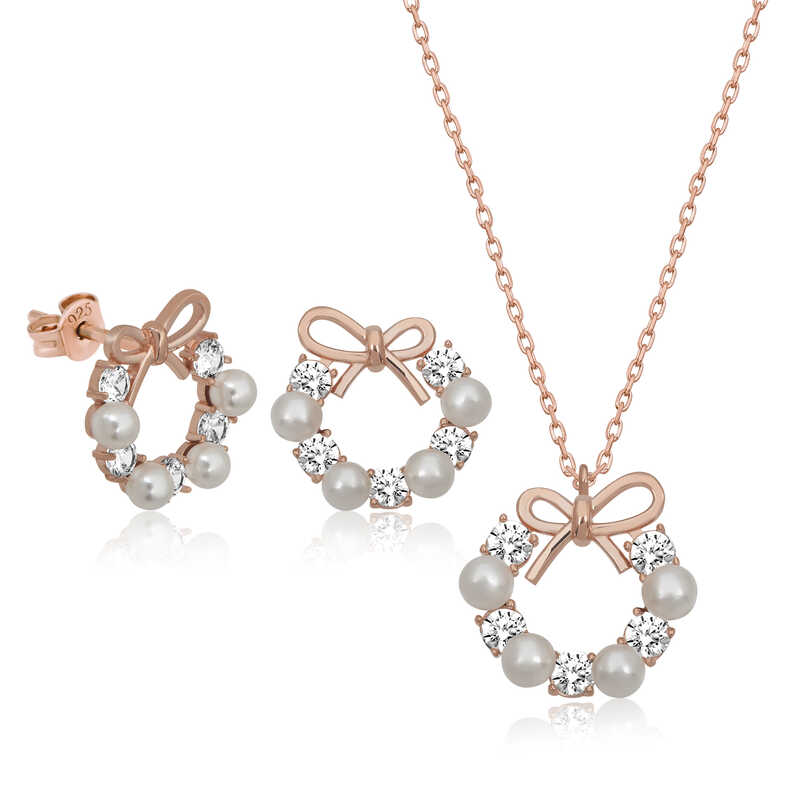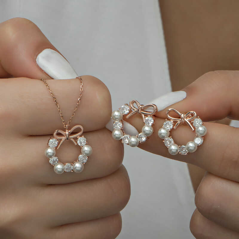 Silver Pearl Ribbon Women's SetAppealing to all women who want to achieve an elegant look, the timeless silver pearl stone set is waiting for you. How about adding sparkle to your surroundings with the dazzling sparkle of rose plated silver, pearl and zircon stone... The pearl set, which you and your loved ones will enjoy wearing, will also be one of the best gifts to share your love... Made of 925 sterling silver. Rose plated silver is made. Rose plated products preserve their shine for a long time and oxidation is delayed. The white stones on them are zircon and the pearl is cultured pearl. All of our products are handmade. Due to silver and precious stones, there may be ± 10% deviation in product weight.Width: 1.80 cmLength: 1.70 cmChain Length: 45 cmAverage Weight: 8 gr.