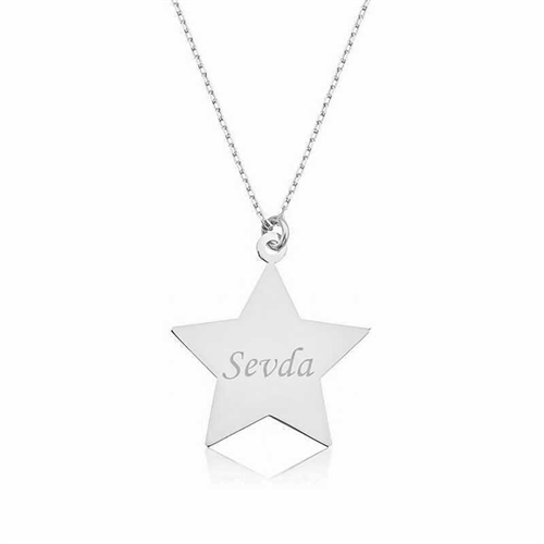 Silver Personalized Named Star Necklace Reminiscent of the bright shine of the night, the star symbolically represents the infinity of the universe, a point in the distance. It is the symbol of shine, light, illumination and hope. Every love is special, every loved one is unique. Let the lifelong union of unique loves come to life on the skin of the woman you love with a personalized star figured necklace. Let the stars witness your love. All of our products are handmade. Personalized named star women's necklace model is made of 925 sterling silver. Rhodium plated on silver. Rhodium plated silver women's necklaces preserve their shine for a long time and delay oxidation. There may be ± 10% deviation from the average product weight due to silver and precious stones. Note: Returns are not accepted for personalized products. Width: 2.40 cm Length: 2.80 cm Weight: 3.10 gr.