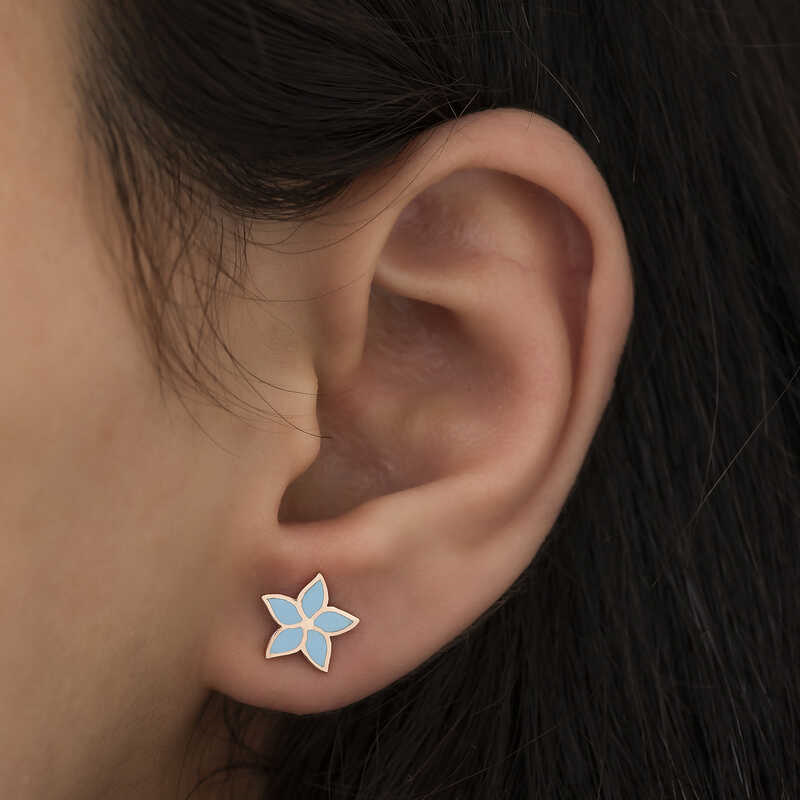 Silver Petunia Flower EarringsOur collection includes different earring models that can adapt to the style of women of all ages, and uniquely designed earring models are waiting for you. The earring created using the petunia flower figure will blow your mind. A model suitable for daily use, these earrings are with you at all times. You will love using the dazzling silver petunia flower earrings. You will definitely find the right earring for both you and your loved ones in this collection. Silver petunia flower earrings are made of 925 sterling silver. Rose plated silver. Rose plated silver women's earrings preserve their shine for a long time and oxidation is delayed. They have blue enamel on them. Like all silver women's earrings, these silver petunia flower earrings are also handmade. Due to silver and precious stones, there may be a ± 10% deviation in the average product weight.Width: 1.00 cmLength: 1.00 cmAverage Weight: 1.35 gr.