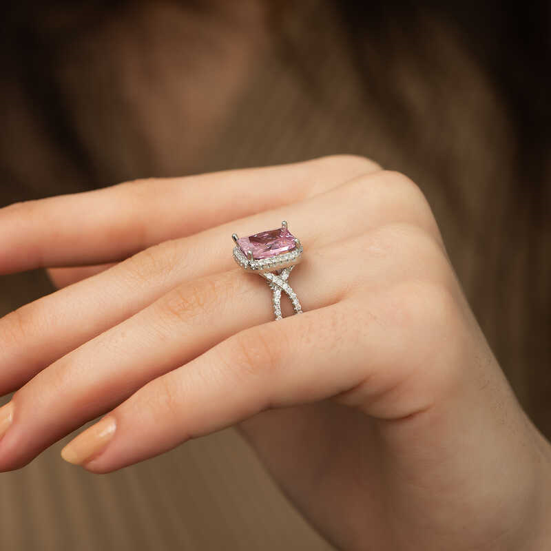 Silver Pink Baguette Women's RingThis specially designed baguette square ring, which you can easily use in daily life, is made of 925 sterling silver. Rhodium-plated silver. Rhodium-plated women's silver ring models preserve their shine for a long time and oxidation is delayed. The stones on the ring are zircon. It is a perfect gift option for your loved one on birthdays, Valentine's Day and special occasions. As with all of our silver women's ring models, this baguette cut women's ring is entirely handmade. Due to silver and precious stones, there may be ± 10% deviation from the average product weight.Width: 2.00 cm.Length: 2.50 cm.Average Weight: 5.00 gr.