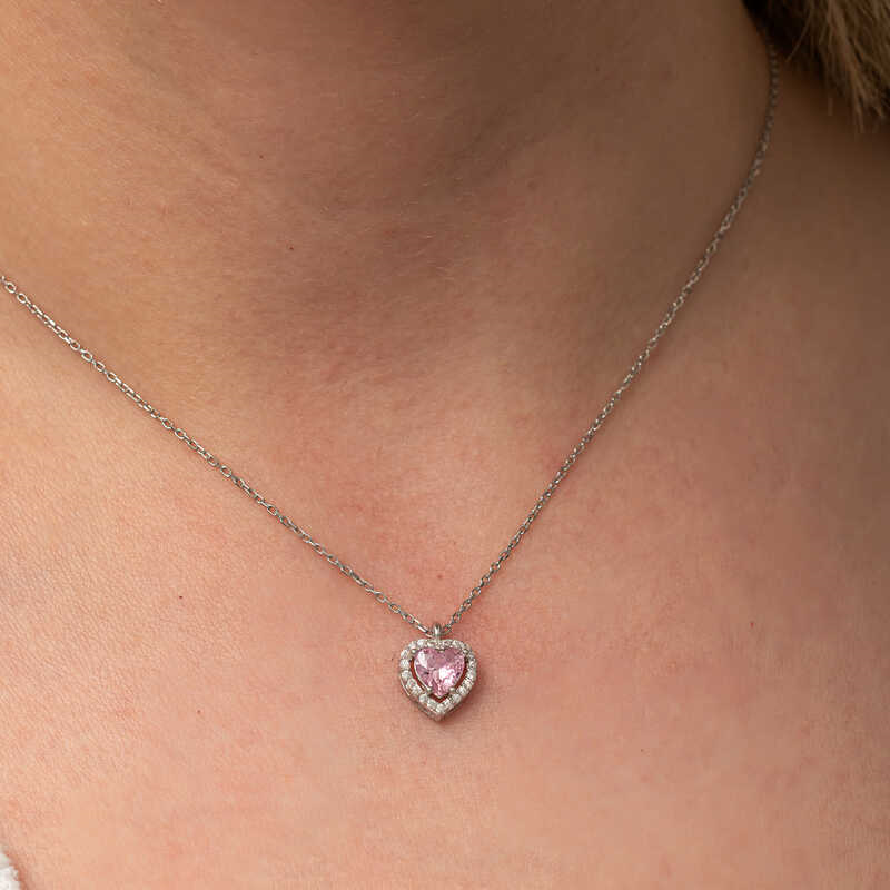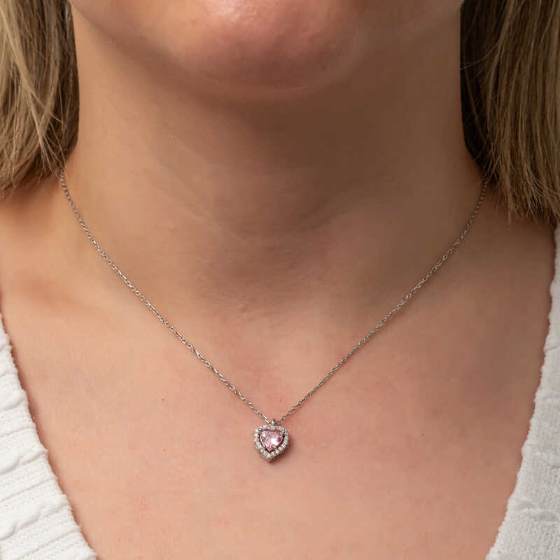 Silver Pink Stone Heart Women's Necklace The heart symbol has always been the symbol of unconditional love and passion. In religious teachings, the power of the heart is limitless. Because the heart is the house of the Creator and our gateway to reality, which opens to the universe. This stylish silver heart necklace is a perfect option for a birthday gift, a Valentine's Day gift or a gift for mothers on special occasions. The silver heart women's necklace is made of 925 sterling silver. This necklace is rhodium plated. Rhodium plated silver women's necklace models preserve their shine for a long time. The stones on it are zircon. Like all our silver women's necklace models, the silver heart women's necklace model is produced by hand. Due to silver and precious stones, there may be a ± 10% deviation in the average product weight. Heart Width: 1 cm Heart Length: 1.30 cm Chain Length: 45 cm Average Weight: 2.40 gr.