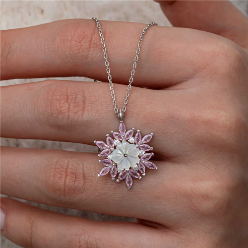 Silver Pink Lotus Patterned Flower Women's Necklace The lotus flower symbolizes purity, rebirth, and spiritual enlightenment. The pink lotus carries meanings such as purity, peace, and spiritual enlightenment. It symbolizes enlightenment, especially in Buddhism. Traditionally, the roots of this flower are found in dark waters, while the flowers bloom on the surface; this represents growth and development in the face of challenges. This stylish necklace is a perfect choice for a birthday gift, Valentine's Day, or special occasions. The necklace is made of 925 sterling silver. The silver is rhodium-plated. Like other necklaces, the silver pink lotus flower necklace is handmade. There may be a ± 10% deviation from the average product weight due to silver and precious stones. Width: 1.80 cm Height: 2.00 cm Average Weight: 3.20 gr. Chain Length: 45.00 cm