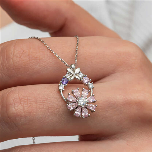 Silver Pink Swirling Flower Women's Necklace Why not express your feelings to your loved ones with an elegant floral patterned necklace? This stylish necklace, which is among the gift options that you can send to her on special occasions, is among the most beautiful ways to make your loved ones happy. Crafted with the highest quality, brightest, and most sparkling stones, the silver pink flower women's necklace is waiting for those who want to express their love once again, for those who want to say "you are a flower." This specially designed silver pink flower women's necklace is made of 925 sterling silver. Rhodium plating is applied on the silver. Rhodium-plated silver women's necklace models preserve their shine for a long time and oxidation is delayed. The average silver chain length is 45 cm. Like all women's silver necklace models, the silver white flower women's necklace is also handmade. Due to silver and precious stones, there may be ± 10% deviation in the specified product weight. Width: 1.10 cm Length: 2.00 cm Average Weight: 3.10 gr. Chain Length: 45.00 cm