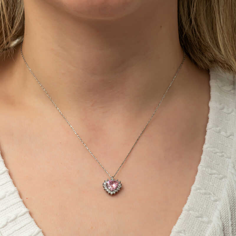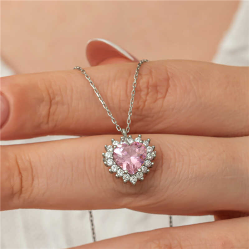 Silver Pink Stone Heart Women's Necklace The heart symbol has always been the symbol of unconditional love and passion. In religious teachings, the power of the heart is limitless. Because the heart is the house of the Creator and our gateway to reality, which opens to the universe. This stylish silver heart necklace is a perfect option for a birthday gift, a Valentine's Day gift or a gift for mothers on special occasions. The silver heart women's necklace is made of 925 sterling silver. This necklace is rhodium plated. Rhodium plated silver women's necklace models preserve their shine for a long time. The stones on it are zircon. Like all our silver women's necklace models, the silver heart women's necklace model is produced by hand. Due to silver and precious stones, there may be ± 10% deviation in the average product weight. Heart Width: 1.30 cm Heart Length: 1.50 cm Chain Length: 45 cm Average Weight: 2.60 gr.