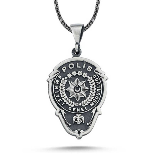 Silver Police Department Police Crest Necklace This 925 sterling silver necklace, specially designed for police officers and crafted with first-class workmanship, will be an accessory you will enjoy using. The necklace is oxidized. Oxidized silver necklace models achieve an authentic look. All of our products are hand-made. The average silver chain length is 55 cm. Due to silver and precious stones, there may be a ± 10% deviation in the average product weight. Width: 2.10 cm Length: 4.00 cm Average Weight: 11.20 gr. Chain length: 55 cm