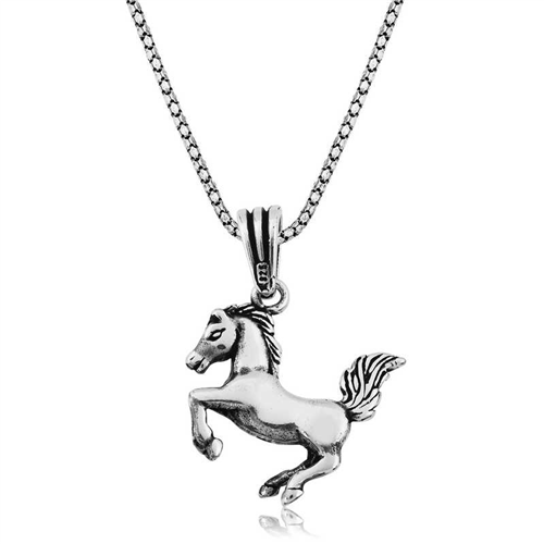 Silver Prancing Horse Necklace Horses have an extremely important place in Turkish culture; horses symbolize power and freedom. How about giving a meaningful gift with a horse necklace, which is a symbol of murat for your loved ones and will fuel their success? The specially designed prancing horse necklace will be one of those necklaces that you will not want to take off your neck. Made of 925 sterling silver, you can gift this specially designed necklace to those you love and care about as a symbol of power and freedom. The silver prancing horse necklace is oxidized. Oxidized silver necklace models preserve their shine for a long time. Like all silver necklace models, the silver prancing horse necklace is produced by hand. Due to silver and precious stones, there may be a ± 10% deviation in the average product weight. Width: 2.50 cm Length: 2.00 cm Average Weight: 11.00 gr.
