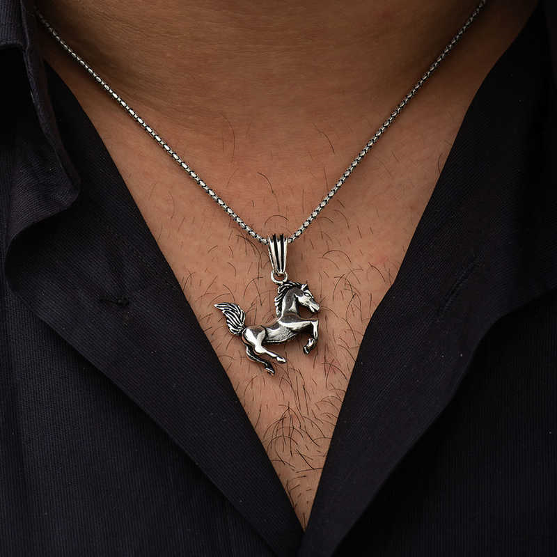 Silver Prancing Horse Necklace Horses have an extremely important place in Turkish culture; horses symbolize power and freedom. How about giving a meaningful gift with a horse necklace, which is a symbol of murat for your loved ones and will fuel their success? The specially designed prancing horse necklace will be one of those necklaces that you will not want to take off your neck. Made of 925 sterling silver, you can gift this specially designed necklace to those you love and care about as a symbol of power and freedom. The silver prancing horse necklace is oxidized. Oxidized silver necklace models preserve their shine for a long time. Like all silver necklace models, the silver prancing horse necklace is produced by hand. Due to silver and precious stones, there may be a ± 10% deviation in the average product weight. Width: 2.50 cm Length: 2.00 cm Average Weight: 11.00 gr.