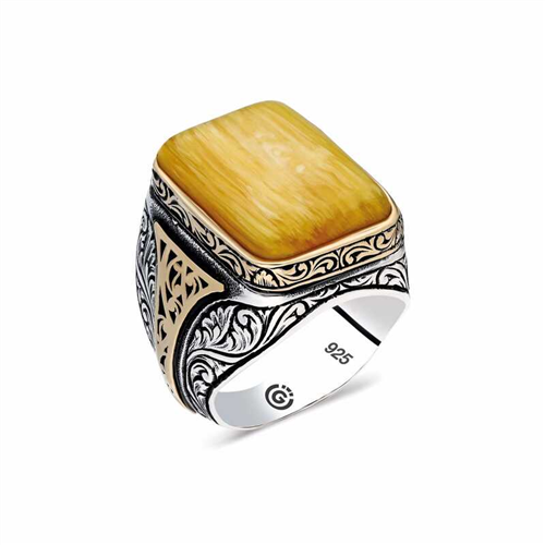 Silver Square Men's Ring with Pressed Amber StoneThis men's ring model, made of Pressed Amber stone on silver, is a stylish accessory that you can use at any time of the day. You can gift this ring to yourself or your loved ones on your birthday, Father's Day or special occasions. The Pressed Amber stone men's ring model is made of 925 sterling silver. Oxidized silver is coated. Oxidized silver men's rings preserve their shine for a long time. As with all men's rings, the Silver Square Men's Ring model is also handmade. Due to silver and precious stones, there may be a ± 10% deviation from the average product weight.Average Weight: 17.00 gr.