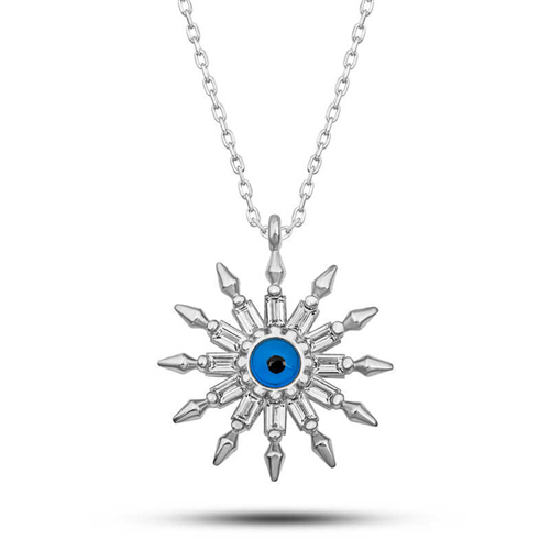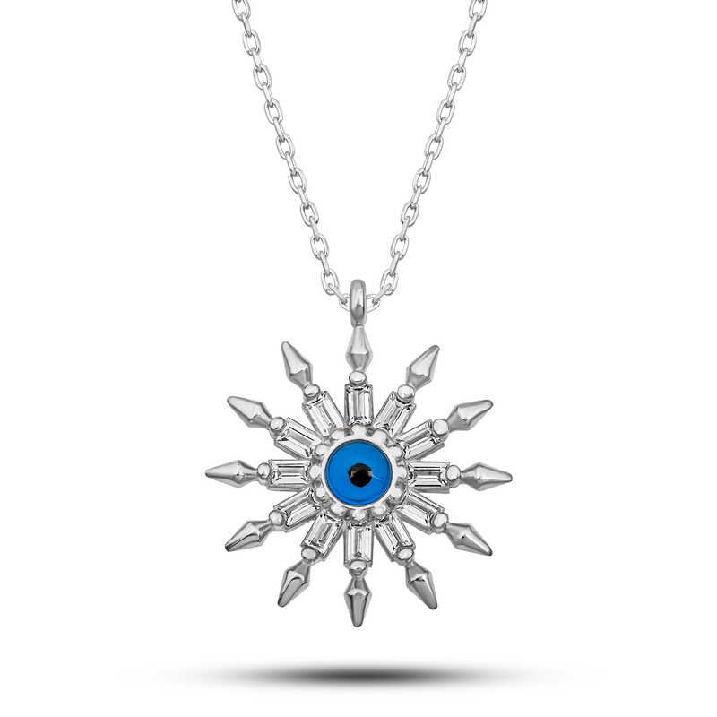 Silver Protective Eye Sun Women's Necklace The belief in the evil eye (protective eye) aims to protect against bad energies that may be caused by a jealous look. It has been used in many cultures since ancient Mesopotamia. This necklace combines the protective eye with the sun symbol that radiates positive energy; it offers both a spiritual defense mechanism and a life-giving force. The blue eye symbol evokes peace, positive energy and spiritual serenity. Rhodium plated silver. Rhodium-plated silver products preserve their shine for a long time and oxidation is delayed. Like all silver necklaces, the protective eye sun necklace is entirely handmade. Due to silver and precious stones, there may be a ± 10% deviation in the average product weight. Width: 2.00 cm Length: 2.30 cm Average Weight: 3.45 gr. Chain Length: 45.00 cm