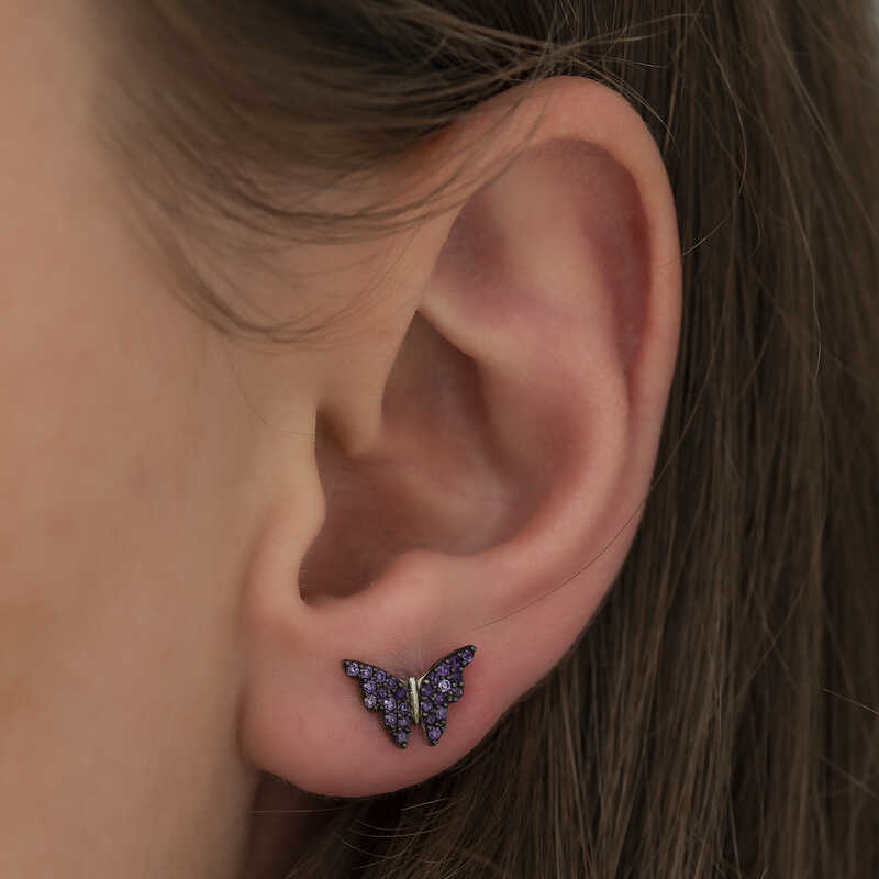 Silver Purple Butterfly Earrings Our collection includes different earring models that can adapt to the style of women of all ages, and uniquely designed earring models are waiting for you. The earring designed using the butterfly figure will blow your mind. A model suitable for daily use, the earring is with you at all times. You will love using the dazzling silver butterfly earrings. You will definitely find the right earring for both you and your loved ones in this collection. Silver purple butterfly earrings are made of 925 sterling silver. Rhodium plated silver. Rhodium plated silver women's earrings preserve their shine for a long time and oxidation is delayed. The stones on them are zircon. Like all silver women's earrings, this silver purple butterfly earring model is also handmade. Due to silver and precious stones, there may be a ± 10% deviation in the average product weight. Width: 2.10 cm Length: 0.80 cm Average Weight: 1.20 gr.