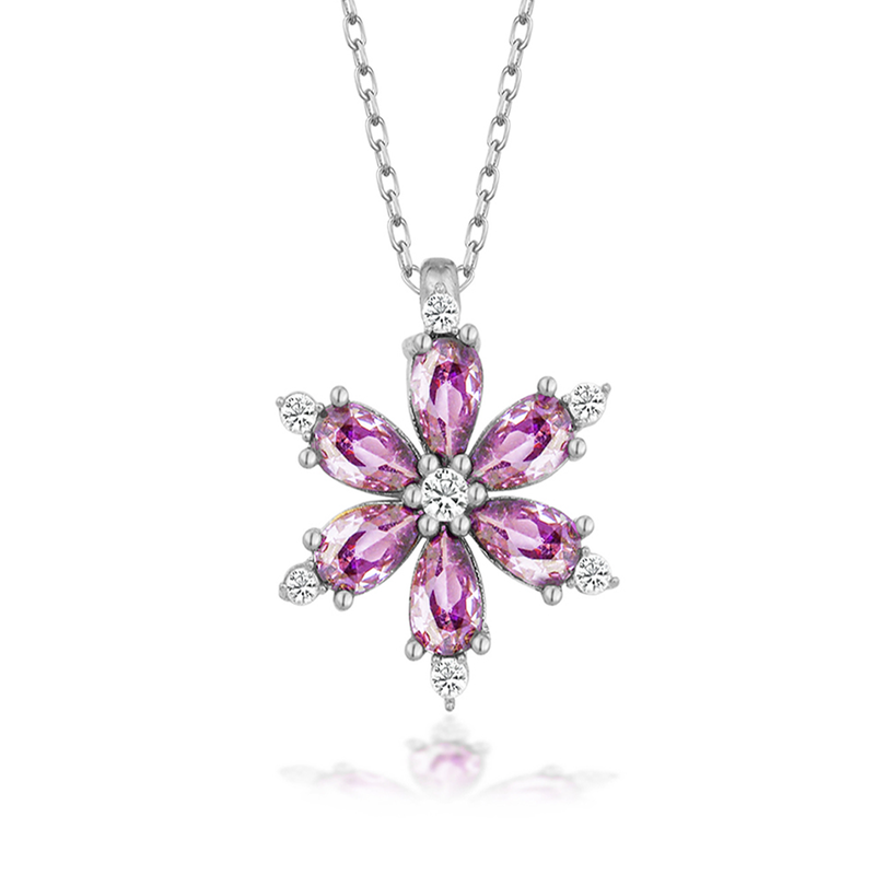 Silver Purple Lotus Flower Women's Necklace The Lotus Flower is one of the most beautiful flowers that symbolizes spirituality, morality, and cleansing. The lotus flower, which blooms in the polluted waters of the rainforest, has managed to become a symbol of beliefs such as Buddhism and Hinduism with its beauty and purity. Moreover, the lotus flower is considered sacred in many ancient civilizations. Another detail that makes the lotus flower special is the region in which the flower grows. The lotus flower, which grows especially in swamps and muddy lands, can remain clean despite the polluted environment in which it grows. Able to clean even a single particle of dust that lands on it, the lotus flower greets those who encounter it with pure beauty. You can gift the Silver Purple Lotus Flower necklace, which is considered sacred in different cultures, to your loved ones or to treat yourself. This stylish necklace is a perfect option for a birthday gift, Valentine's Day or special occasions. The necklace is made of 925 sterling silver. The silver is rhodium plated. Like other necklaces, the silver Purple lotus flower necklace is also handmade. Due to silver and precious stones, there may be a ± 10% deviation from the average product weight. Width: 1.70 cm Length: 2.00 cm Average Weight: 2.40 gr. Chain Length: 45.00 cm