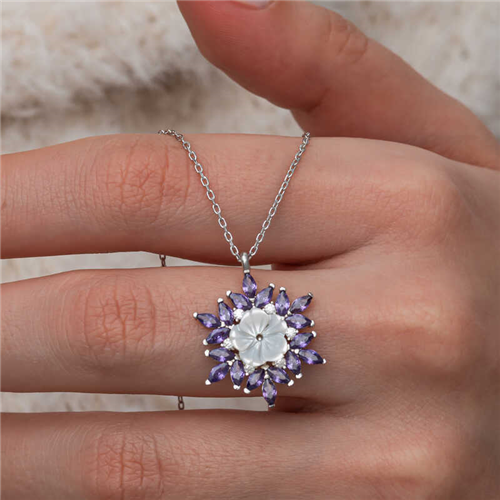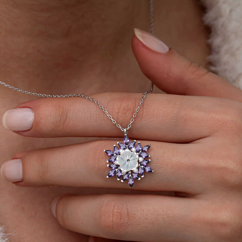 Silver Purple Lotus Patterned Flower Women's Necklace The lotus flower symbolizes purity, rebirth and spiritual enlightenment. The color purple is often associated with spiritual depth and nobility. This stylish necklace is a perfect option for a birthday gift, Valentine's Day or special occasions. The necklace is made of 925 sterling silver. Rhodium plated on the silver. Like other necklaces, the silver purple lotus flower necklace is handmade. Due to silver and precious stones, there may be ± 10% deviation from the average product weight. Width: 1.80 cm Length: 2.00 cm Avg. Weight: 3.20 gr. Chain Length: 45.00 cm